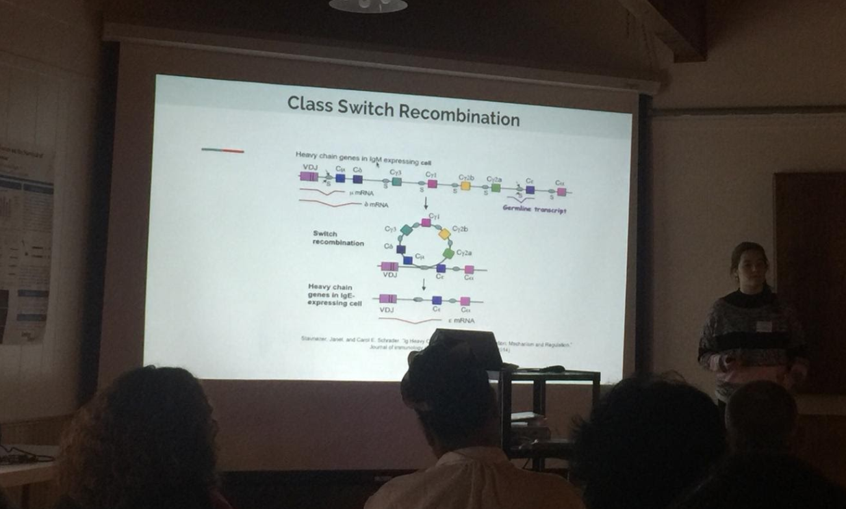 Tzippora Chwat presenting about AID and Class Switch Recombination at the Opportunities in Research and Creative Arts (ORCA) Symposium after winning a role in their summer scholarship program in 2018.